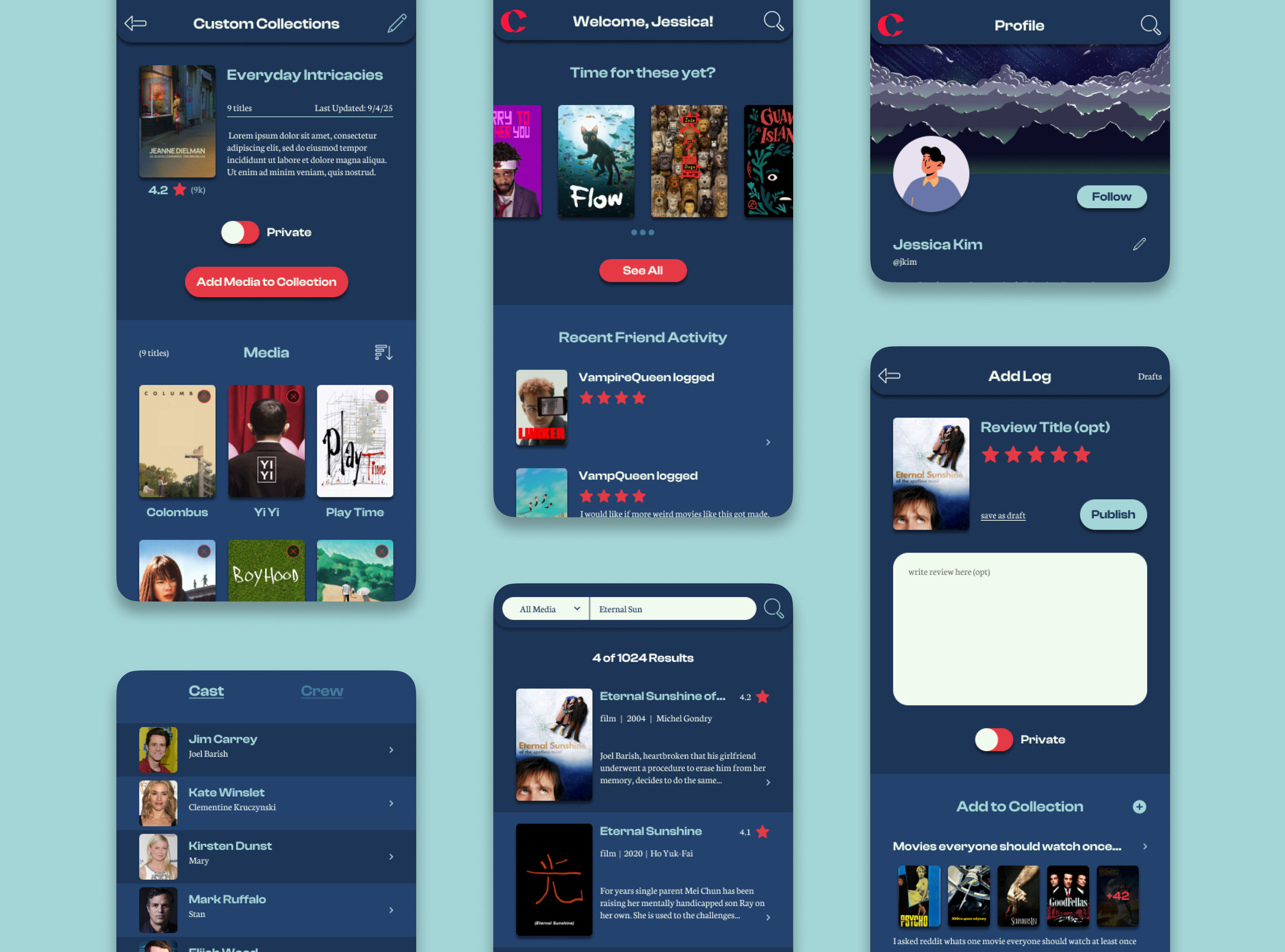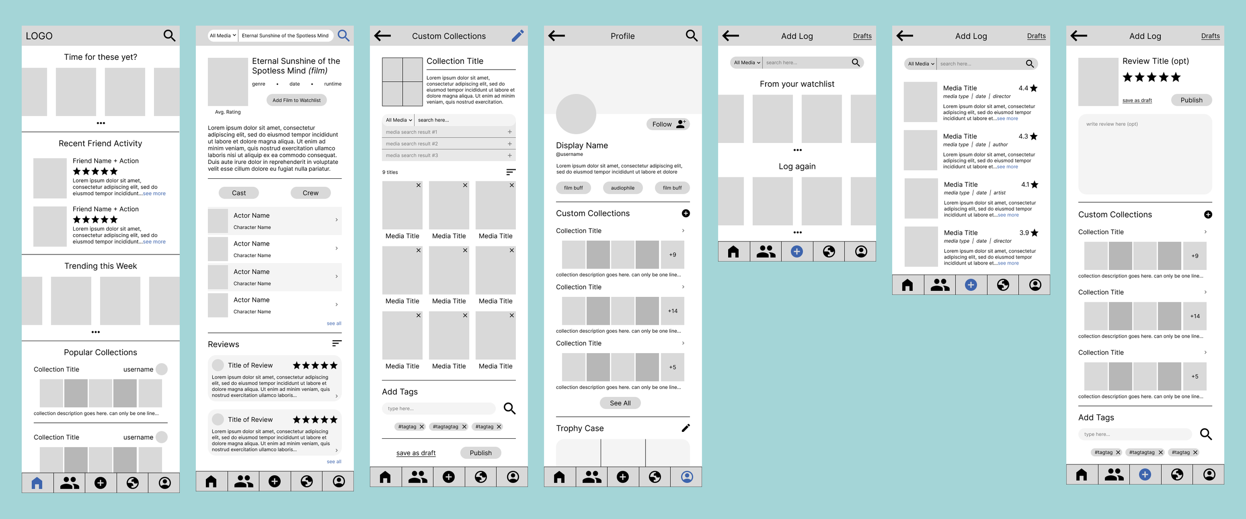 Shows how users create a new log entry by selecting or searching for media, then optionally adding tags, ratings, or reflections. Users can save drafts privately or publish entries to share. Designed to reduce friction which supports both quick and deeper reflection logging styles.