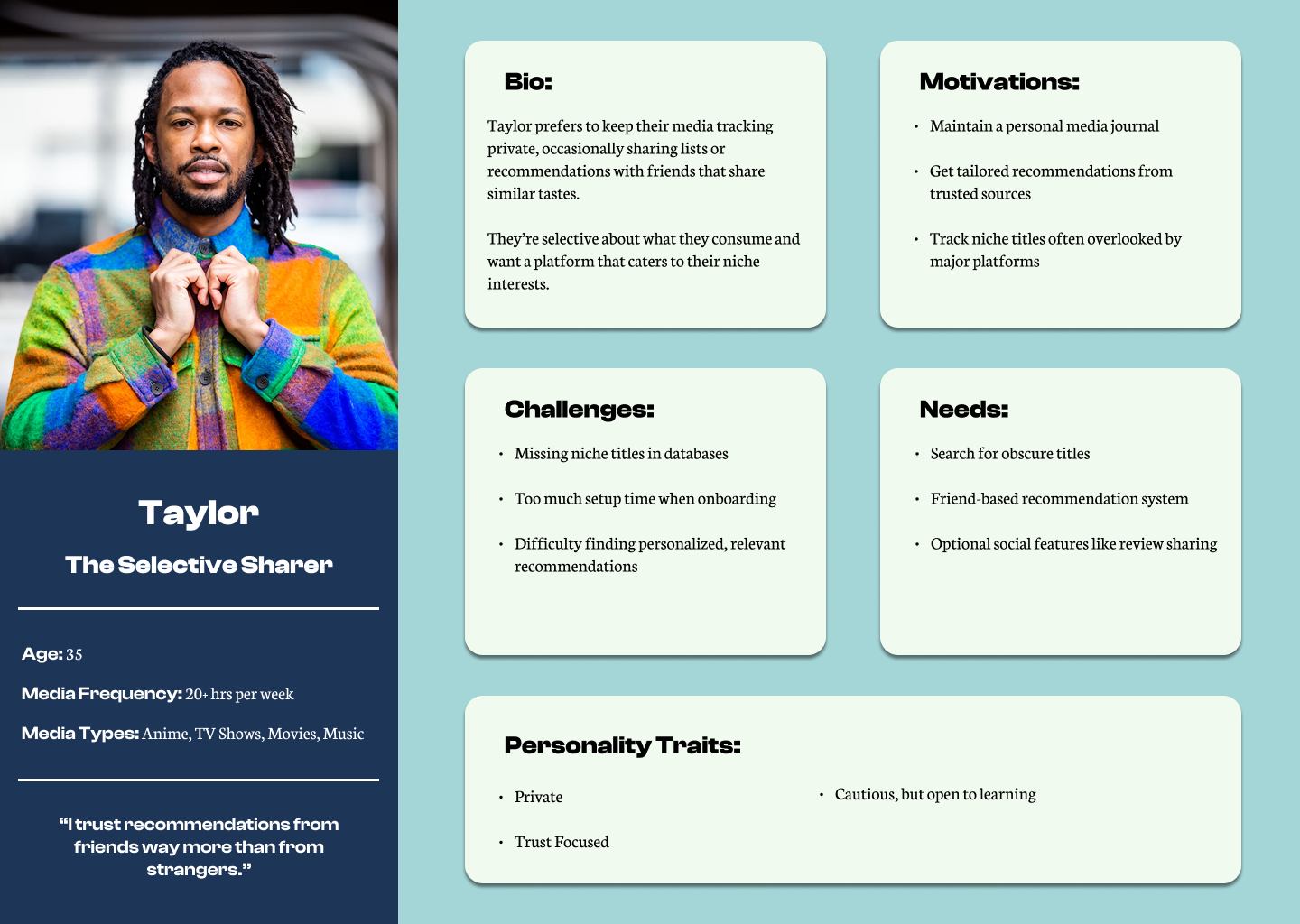Taylor prefers to keep media tracking private, only sharing with trusted friends who have similar tastes.