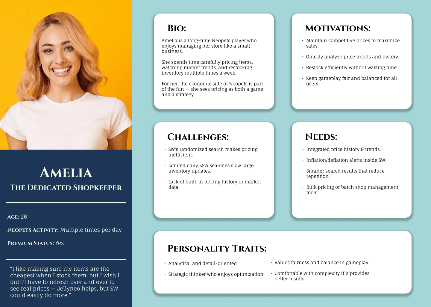 The competitive analysis highlighted how other online marketplaces streamline search, filtering, and price comparison, exposing the Shop Wizardās outdated design and missed opportunities. Conversations with Neopetsā players revealed common frustrations around slow searches, clunky navigation, and difficulty finding the best deals.