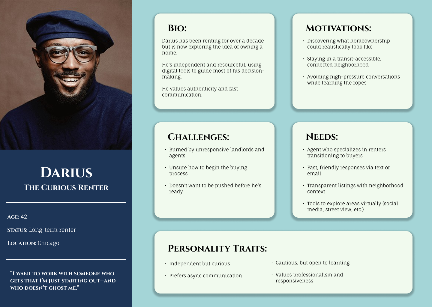 The competitive analysis revealed how other agents present themselves online, highlighting gaps in approachability, personality, and trust-building. Interviews with prospective & previous buyers uncovered what clients look for in an agent’s site, from clear property details to an easy way to make contact.